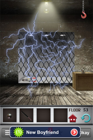 Slide the HOOK down to the Wooden Box. The box will follow the HOOK to go up and unplug the cable. Now, pickup the Big Pliers and use them to cut metal gate. Once You done that You can go inside.