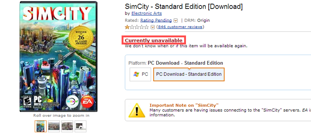 Amazon has temporarily disabled sales of SimCity in response to numerous complaints. As indicated by the game's growing list of over 1,000 negative reviews, customers are not happy about not able to play the latest in Maxis' list of simulation titles. Several customers have shared their success with obtaining refunds, while others are stuck biting their fingernails while trying to merely log into the game. Amazon has deferred to saving future customers from the agony.