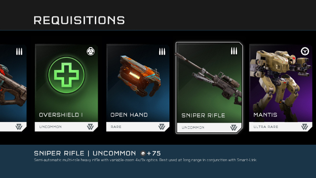 You will earn Requisition Points based on your performance in Arena and Warzone matches. You can choose to spend these on one of three levels of Requisition Pack. It is recommended to spend these on the 10,000 point Gold Requisition Pack since only this type of pack includes the extremely rare items.