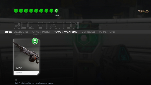 Above is the Req Station menu. On the top left you can see your Req Level. On the left side you can see that the SAW weapon is selected, which is a Common item. It requires 5 Req Level to use, as denoted by the green hexagon. Below that you can see that the player only has one of these cards, so after its use the player will need to acquire another one.
