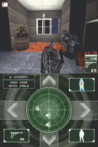 And for the first minute or so, the DS version kind of feels like Splinter Cell, too. In an attempt to emulate the 3D console games, this version lets you move Sam around with the D-pad and control the camera with the stylus, but as soon as you attempt both at once, things get a little sour. The camera can be controlled analogously by moving the stylus around in the center of the touch screen or digitally by pressing on arrows at the four edges, but regardless of your choice, it never moves smoothly and neither does Sam.
