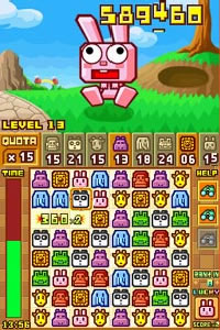 Like most decent games in this genre, the gameplay is simple and addictive. Using the DS stylus and the touchpad, you can swap any two adjacent animal heads with the goal of lining up 3 (or more) in a horizontal or vertical row. Doing so will make the row disappear, leaving a gap for more animals to descend from the endless pile of animals in the sky. “Chaining” together strings of completed rows as the animals fall into place will get you bonus points and put some time back on the descending Timer of Doom. Do well, and when time runs out, you can put your name on the high score board.