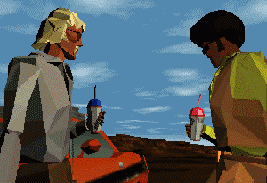 The intro sequence RULES. The characters are strictly polygonal; however, not many polygons are used. This creates a really authentic mood. Big, blocky polygons enhance the overblown attitudes and threads of 70’s life. The shots are hysterical – Starsky and Hutch meet Pulp Fiction. All of the cut scenes use the same graphics, and are very well-directed. You actually feel as though you’re watching a finely crafted blacksploitation epic. Oddly enough, someone forgot to include mouths. Yup. There are no mouths in this game. Guess that’s one of those long lost quaalude side-effects (not that I’d know…).