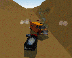 As this is a car game, it would be silly if you didn’t have any cars. Well rest easy, baby, ’cause there are 30 authentic pieces of metal to choose from. Each of these muscle machines can be outfitted to your own preference and in accordance with the car’s design (in Melee mode only, I should note). There’s also a slew of groovy weapons to use, ranging from the always effective 50 caliber machine gun to the aptly named “EZKill Mortar.” Certain weapons must be placed in certain places; you can’t stick a Napalm Hose on your hood, for instance (it’s like pissing up a flagpole).