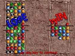 Lose Your Marbles is your standard puzzle game. The object is to get rid of as many marbles as you can as quickly as possible. This is accomplished by lining up at least three marbles of the same color in the Pitch line (the middle row). You deal with five columns of marbles, and as the game wears on, more marbles fill each column.