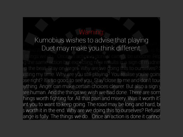 To put it more plainly, one of the screenshots for Duet is a warning from the company that reads, "Warning: Kumobius wishes to advise you that playing Duet may make you think different." It's true, but not in the way that they meant, which I believe was to promote a kind of meditative experience—which I have had with games like the pixel-art walking simulator Proteus. No, what I experienced instead was a not-infrequent fury that a game could so thoroughly botch precision controls, while trolling you with a presentation designed to lull you into a meditative state, then punishing you for not being able to focus on precise tasks, over and over and over again.
